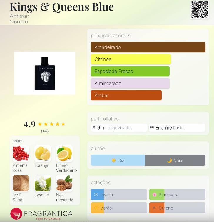 Kings & Queens Blue de Amaran é um perfume Amadeirado Especiado Masculino. Kings & Queens Blue foi lançada em 2021. As notas de topo são: Pimenta Rosa, Toranja e Limão. As notas de coração são: Iso E Super, Jasmim, Noz-moscada e Gengibre. As notas de fundo são: Sândalo, Almíscar Branco, Patchouli, Vetiver, Incenso e Cedro.