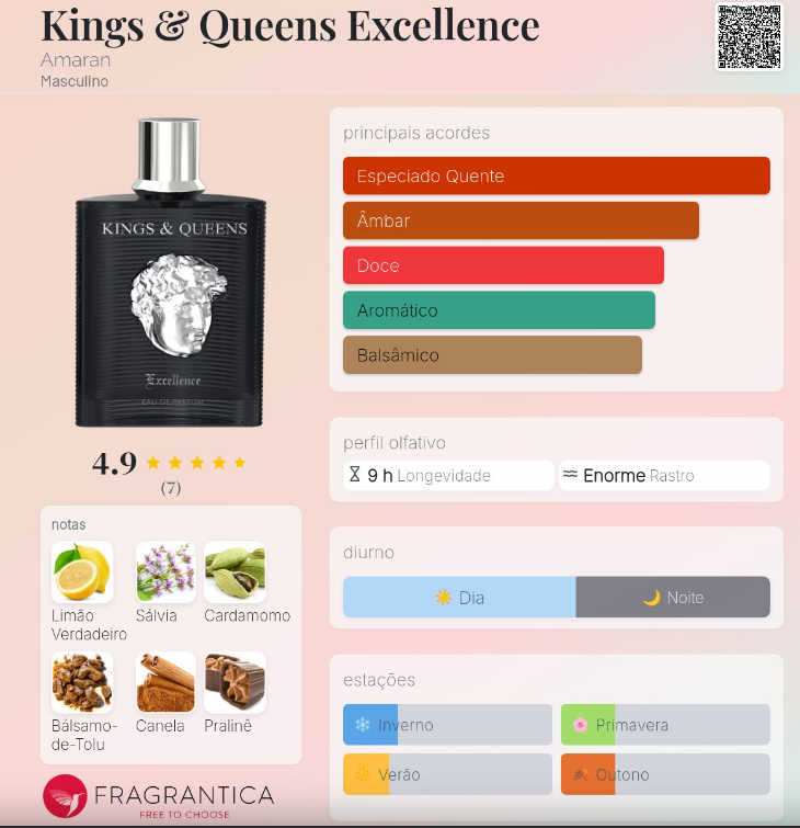 Kings & Queens Excellence de Amaran é um perfume Amadeirado Aromático Masculino. Kings & Queens Excellence foi lançada em 2021. As notas de topo são: Limão e Sálvia. As notas de coração são: Cardamomo Preto, Bálsamo-de-Tolu, Canela e Pralinê. As notas de fundo são: Pau-Rosa, Âmbar Negro e Patchouli.